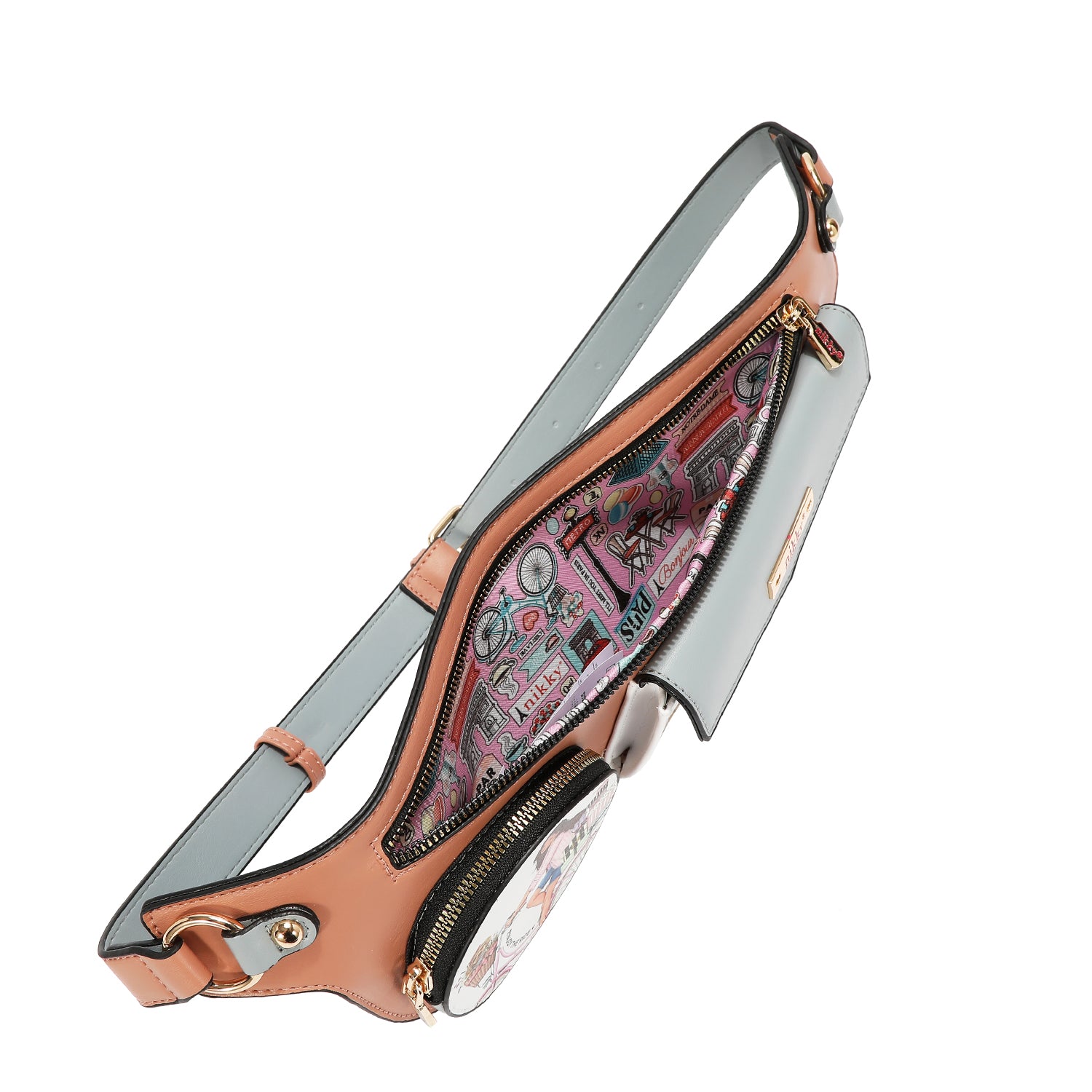 Spacious compartment lined with exclusive Nikky nylon print fabric.