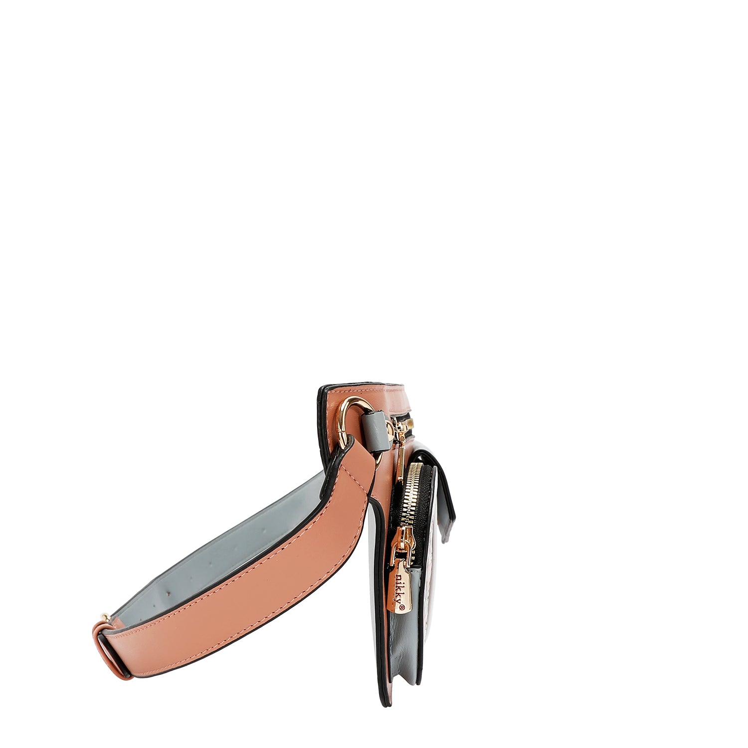 Nikky gold-toned logo nameplate at front.
