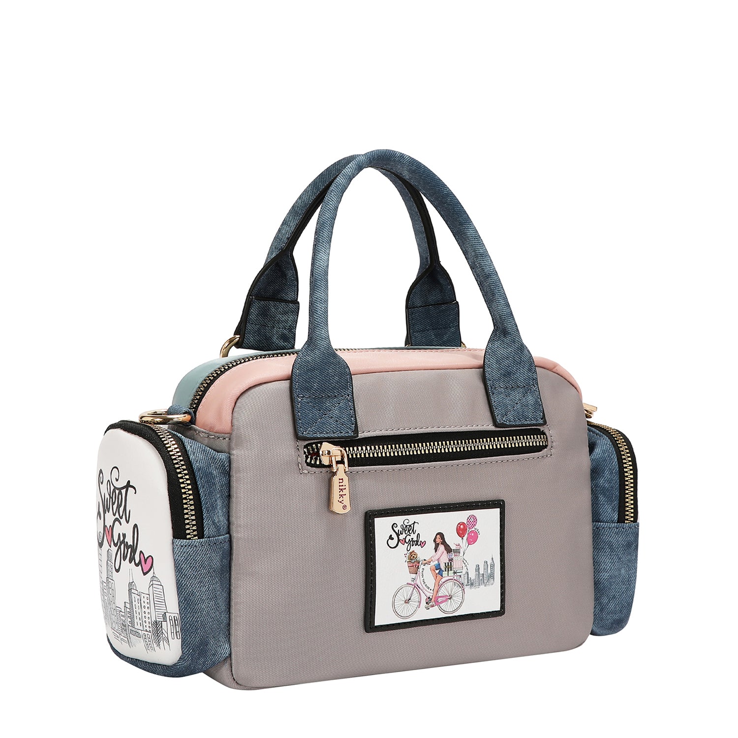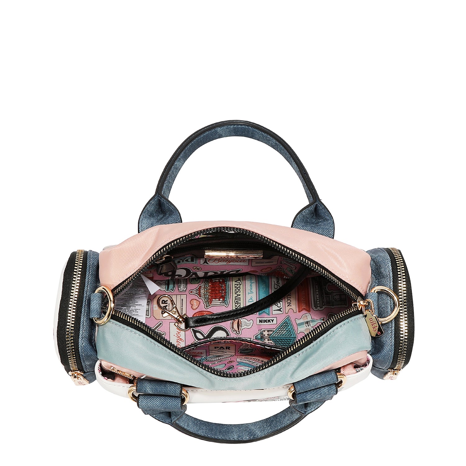 Main zipper closure with Nikky logo engraved zipper pull.