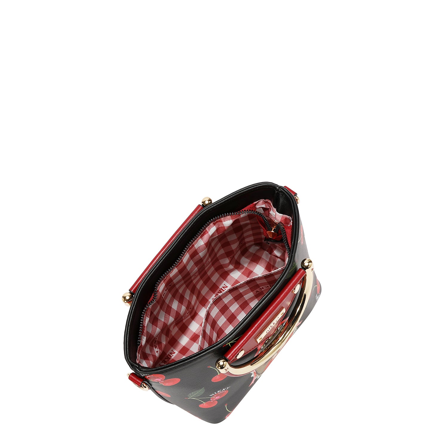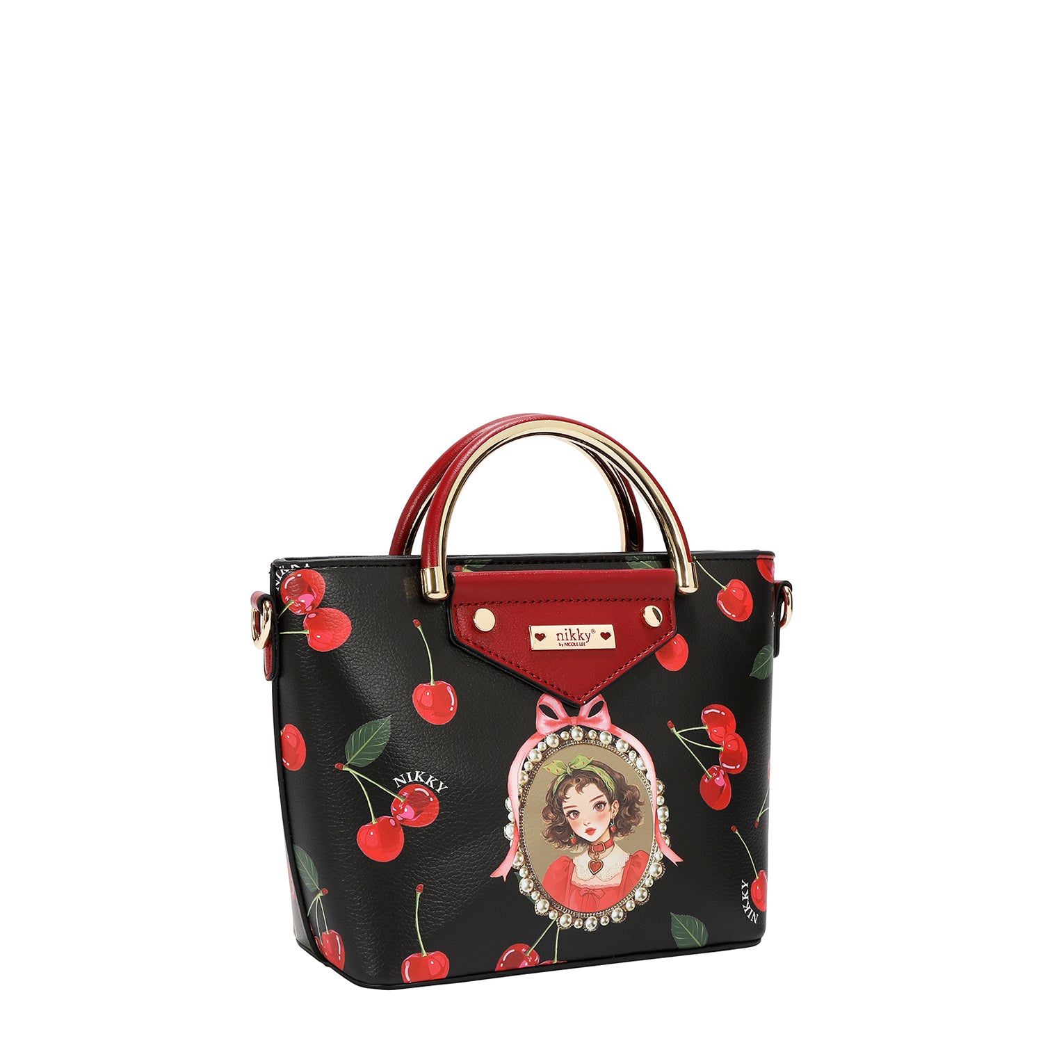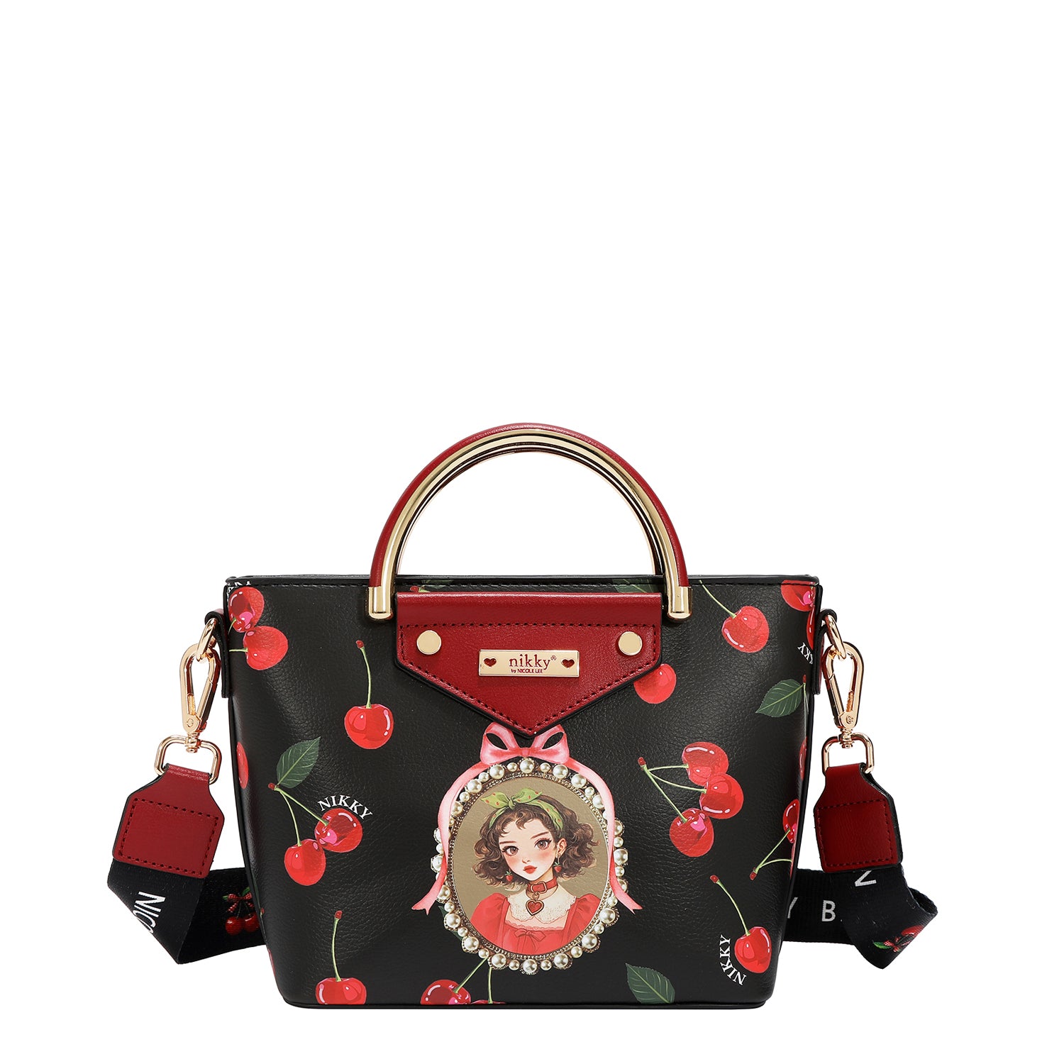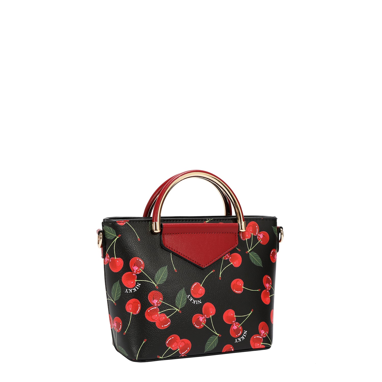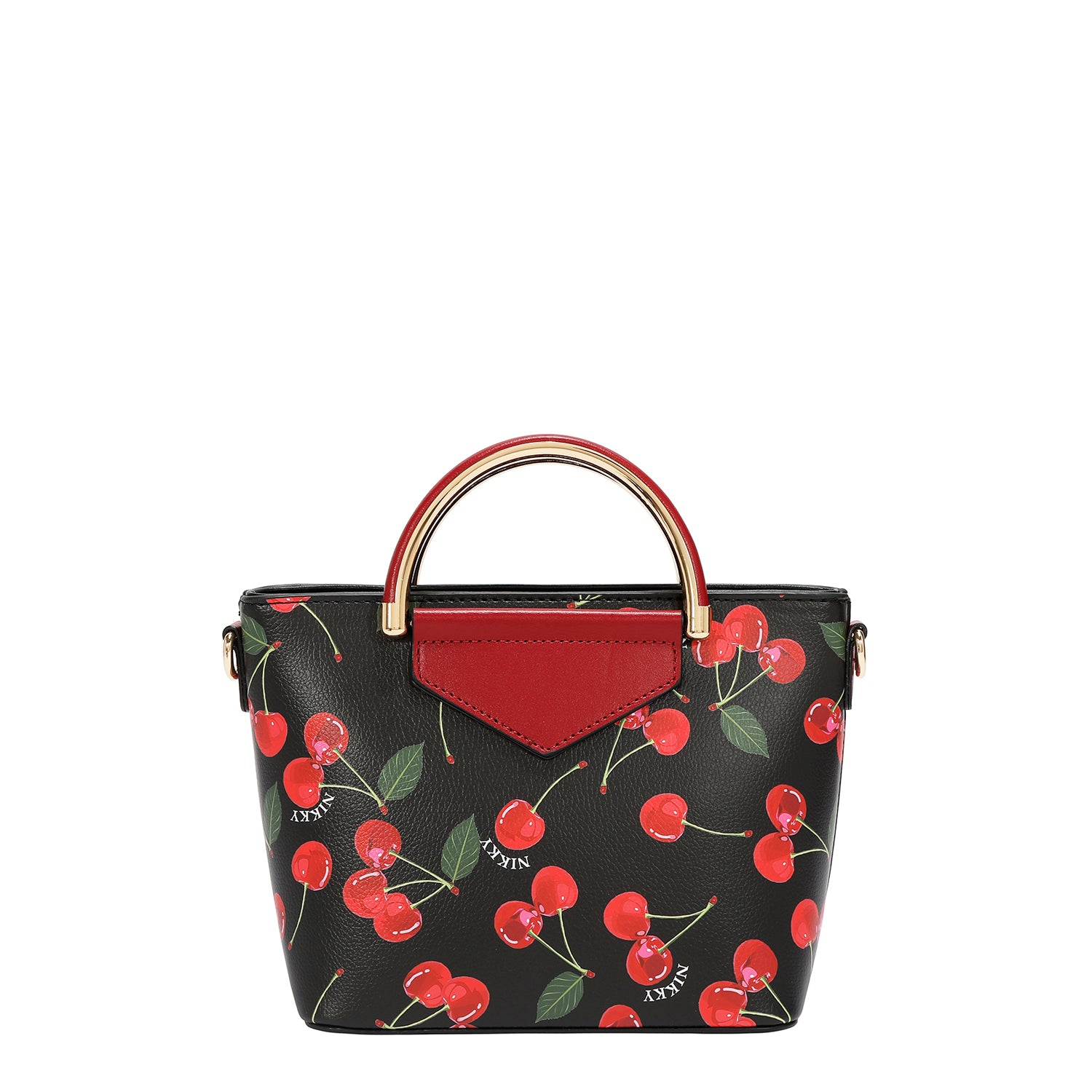 Gold-toned D-rings on sides for shoulder strap.